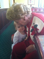 Today we met Bubba, Meredith, Spif, and Granddaddy for lunch to exchange some gifts before Meredith flies home for the holidays. I thought this bow looked cute on HG, but she didn’t really agree. I must have worn her out shopping that morning because she fell asleep in my lap during lunch. I was able to get her to the car without waking her, but she sat straight up when her bottom hit the seat; however, she was soon asleep again and is STILL napping two and a half hours later. I don’t know what to do with myself!