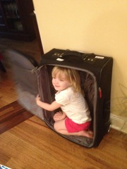Helen Grace discovered John’s suitcase after a business trip and figured out that she fit just perfectly inside it. She was having fun swinging the door open and ‘surprising’ me, but I asked her to pull it away from the wall when I realized she was making marks on it. She did NOT like to be deterred from her plan and decreed that she was never ever coming out. Never! Whew, this was an ugly glimpse into her teenage years!