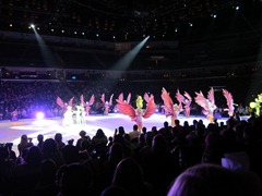 To say that HG was excited was an understatement. She loved that it was going to be a “girls’ night” and even told Granddaddy that maybe he could come “next time.” I could barely get her to go down for a nap that afternoon, and as soon as she woke up, she was ready to GO. I finally gave in and got dressed, and we headed to pick up Spiffer a little early. The timing actually worked well because we were able to get there, pick out our overpriced princess souvenir (a lighted Cinderella spinner), grab some dinner, find our seats (HG practically ran to find our section and then raced down the stairs to the ice), and people watch!