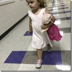 Warming up a bit and heading to see her classroom. While we were walking across campus from HG’s classroom to Cressey’s, I stopped to talk to a teacher that had HG in camp this summer. After a minute or two, Cress tugged my hand and said, “No talk!!” She was ready to see her part of school.
