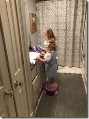 Love this morning routine. Cress has decided it’s cool to hop up there next to sissy to get in line to get her hair done too.