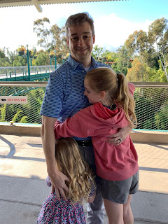 Thursday morning gave us a LOT of rain, so after a very exciting morning of room service breakfast (HG's dream come true, especially when she gets to order it), we started the day with a visit to the Birch Aquarium. Usually, when you walk in the building, you are treated to a panoramic view of the ocean, but that day, clouds completely blocked the view. (Cress was really worried about the fog taking over everything.) The girls flew through the exhibits so quickly that we made a second loop to see what they blew past the first time. The sea dragons, sharks, and teeny tiny seahorses were a family favorite. (The touch pools were closed due to the coronavirus.)