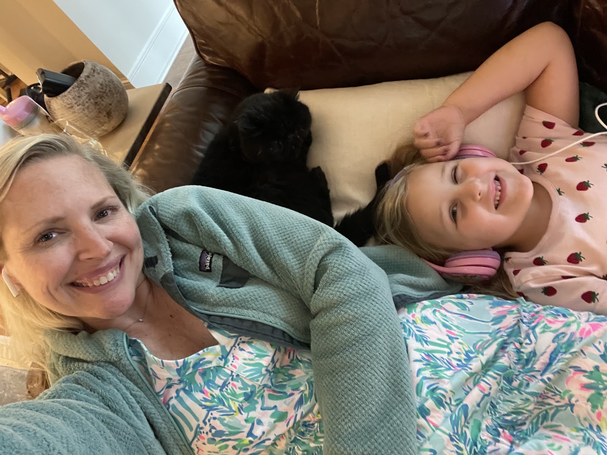Comforting Sunny (in her pjs and with her ipad)